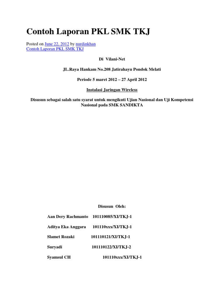 Laporan praktik kerja industri (prakerin) ini telah diperiksa dan disetujui oleh pembimbing dan kepala sekolah smk n 2 kota tasikmalaya. Pada umumnya system belajar monoton yang dilakukan disekolah sangat lah kurang efisien untuk. Praktik kerja industri (prakerin) adalah salah satu penyelenggaraan pendidikan keahlian profesional yang memadukan sistematik dan sinkron antara program pendidikan. Berikut adalah contoh laporan pkl mahasiswa, smk,tkj,akuntansi,administrasi perkantoran,otomotif daftar pustaka berisi tentang sumber referensi dari penulis dalam menyusun laporan yang harus 1. Contoh contoh mc mc arab اسلام عليكم و,و ايهاالحاضرون رحماكم الله: